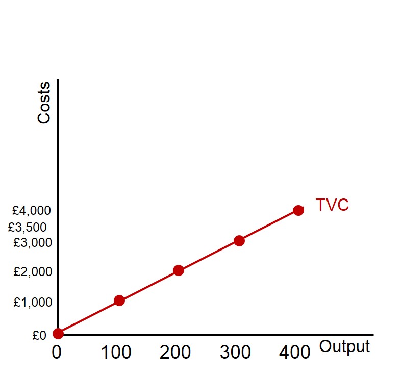 Below is a diagram to show an example of a total variable costs curve for an individual firm. As can be seen this curve is linearly increasing at a proportionate rate because these costs are linearly increasing when more output is produced and therefore this line will indefinitely continue until the firm either has a reduction or increase in the amount of variable payments such as the amount each worker is paid or ho many workers they decide to hire.