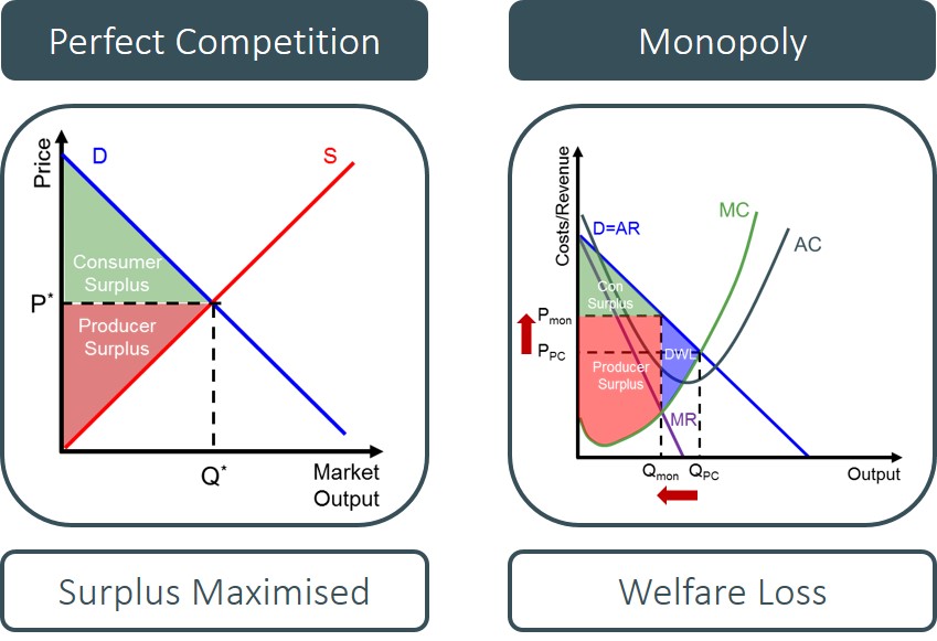 An interesting analytical point to raise when talking about monopolies is the comparison against a perfectly competitive market structure. This is because a monopoly is at the opposite end of the market structure spectrum when compared to perfect competition. When compared to this market structure the market equilibrium is more inefficient and results in lower welfare than compared to a perfectly competitive market because of the fact that monopolists are price makers. The optimal output level for monopolists is below that of a perfectly competitive market, as they set a higher price to maximise profits. As a result, this means that producer surplus increases because of the higher price and consumer surplus decreases due to the higher price. However, as the loss of consumer surplus is larger than the gain in producer surplus, there is an overall dead weight loss triangle created. Under a perfectly competitive market, social welfare is maximised as a result of producing at the point of allocative efficiency. Therefore monopolists reduce the overall level of social welfare in the economy, which is often why they are perceived as bad for an industry.